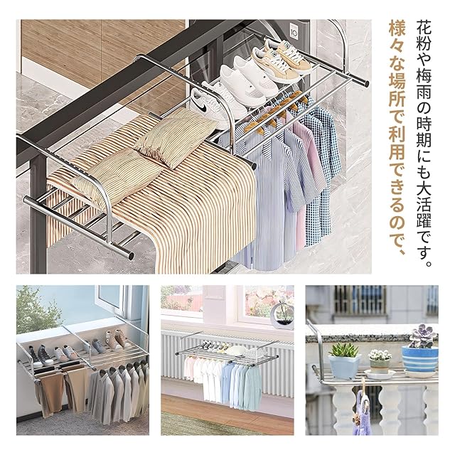【小物も大物も干せる、屋内屋外両対応】多機能な物干しは、日常の洗濯物だけでなく、シーツやタオルなどの大物を干すことも完璧なに行えます。屋外でも使用可能で、花のスタンドや植物棚など、多目的で利用できます。軽量で携帯性が高く、さまざまな環境に柔軟に応えることができます。ベランダ、手すり、階段、窓辺、洗濯室、ラジエーターなどに適しています。