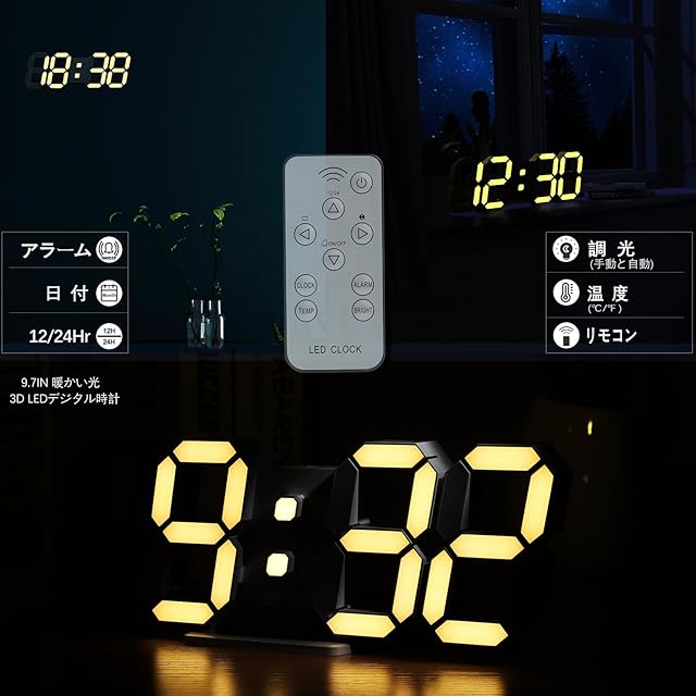 KOSUMOSU デジタル時計 LED時計 壁掛け時計 明るさ自動感応 電球色 3D LED CLOCK 置き時計 目覚まし 10インチリモコン付きナイトランプ年/月/日温度表示 (ACアダプター付属無し) ACD-210Y