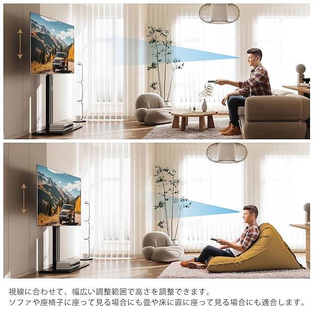 【ラック回転・高さ調節】高さは取り付け位置により、支柱が7段階、ブラケットが2段階の高さ(1077mm~1437mm)を選択して調整することができます。異なる身長のユーザーがテレビの高さに対する要求を完璧的に満たし、便利で快適な視覚的な楽しみを実現します。また、左右方向へ±30°回転することができるので、最適な調整角度で調整し、いろんな視角からの観賞を満たします。リビングルームだけでなく、キッチンや寝室に居ても、回転角度によって、素晴らしい瞬間を見逃しません。