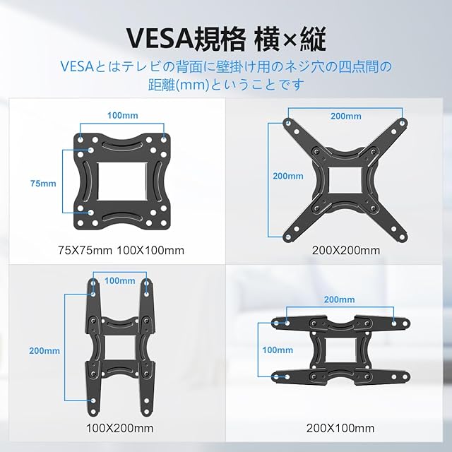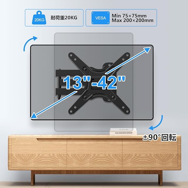 【対応機種】13~42インチモニターやテレビに対応するアーム式壁掛け金具です。耐荷重20kgで 、75×75mm、100×100mm、100×200mm、200×100mm、200×200mmのVESA規格に対応しています。小型テレビにオススメ。※ご注意:乾式壁・石膏ボードのみへの設置はお止めください!木間柱壁の場合は、アンカーを使用しないでください。