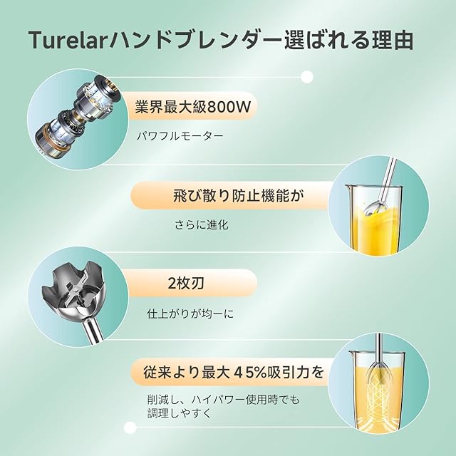 【安全性に優れた二重保護機能】お客様により安心してハンドブレンダーをお使いいただくために、機能だけでなく製品の安全性にも細心の注意を払っています。製品のモーターには、過熱保護と電流過負荷保護という二重安全保護機能が備わっており、高負荷によるモーターの温度上昇を検知して自動停止ですので、火災のリスクなど一切なし!