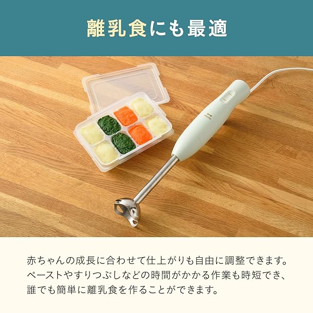ブレンダー(つぶす・混ぜる)、チョッパー(刻む・砕く)、ホイッパー(泡立てる)、2段階速度調節