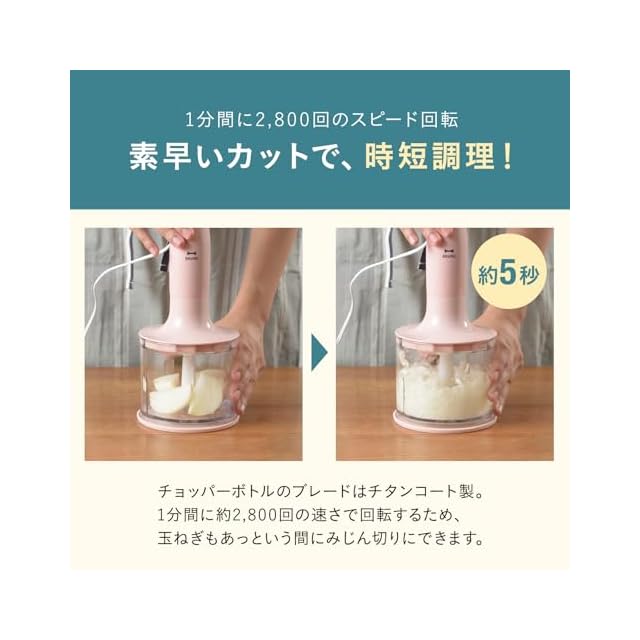 機能:ブレンダー(つぶす、混ぜる)、チョッパー(刻む、砕く)、ホイッパー(泡立てる)