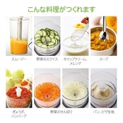 つぶす・混ぜる・泡立てる・きざむ・スライス・せん切り・こねるを簡単に使いこなせる、1台7役の上位モデル