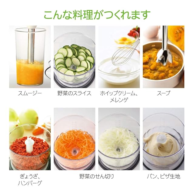 セット内容・付属品:本体(モーター部分)、ブレンダーシャフト、泡立て器、フードプロセッサー(カッター、刃ツール×3種、こねベラ)、専用計量カップ、専用スパチュラ