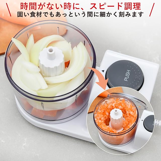 【料理の下ごしらえを簡単に】「刻む」「混ぜる」の2WAYで料理をサポートするフードプロセッサー。みじん切りやハンバーグのタネ作りなどの手間がかかる下ごしらえが簡単・スピーディにできます。