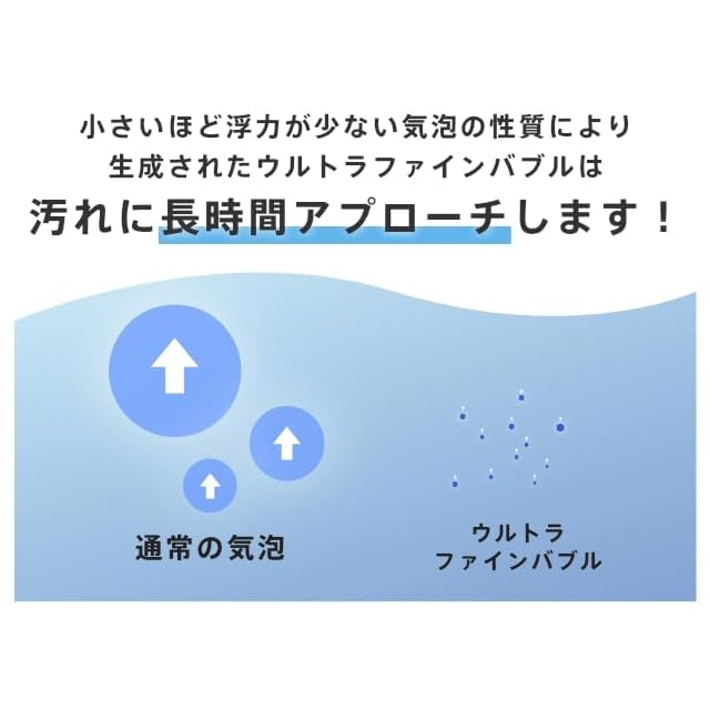 ✅【圧倒的なファインバブル量】 アクアビュルランドリーは、水1mlあたりに約9億500万個ものファインバブルを生成。 この微細な泡が繊維の奥まで入り込み、汚れに吸着して浮かせます。 大量の泡がすみずみまで行き渡ることで、通常の洗濯では落としにくい汚れもスッキリ洗浄。 生乾き臭や洗剤残りなど、洗濯時の不快な悩みに毎回アプローチします。