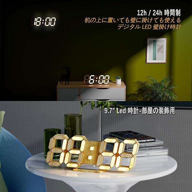 [9.7インチ木目時計]模造木目デジタル時計は、寝室用のモダンな卓上時計として機能し、リビングルーム、キッチン、ジム、ゲームルームなどの壁に簡単に取り付けることもできます。シンプルで控えめです。 サイズ: 9.7x3.9x0.9インチ (142 g)、明確な数字の時計、読みやすい。