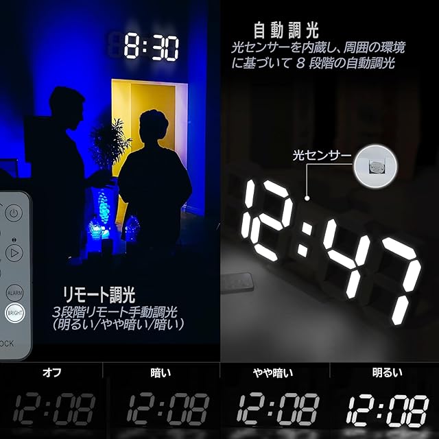 【3d Ledデジタル時計】現代的なデジタル時計、日付、時刻、温度(℃/℉)及び調整可能なナイトライトを表示し、 このクールな壁掛け時計は周囲の光に応じて8段階の自動調光機能が内蔵されています。リモコンで明るさを明るい/やや暗い/暗いの3段階で手動調整することもでき、夜間または遠距離からでも見やすく、クリアで大きく表示されます。