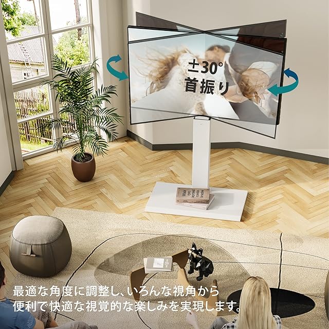 【ラック回転・高さ調節】高さは取り付け位置により、支柱が7段階、ブラケットが2段階の高さ(1077mm~1437mm)を選択して調整することができます。異なる身長のユーザーがテレビの高さに対する要求を完璧的に満たし、便利で快適な視覚的な楽しみを実現します。また、左右方向へ±30°回転することができるので、最適な調整角度で調整し、いろんな視角からの観賞を満たします。リビングルームだけでなく、キッチンや寝室に居ても、回転角度によって、素晴らしい瞬間を見逃しません。