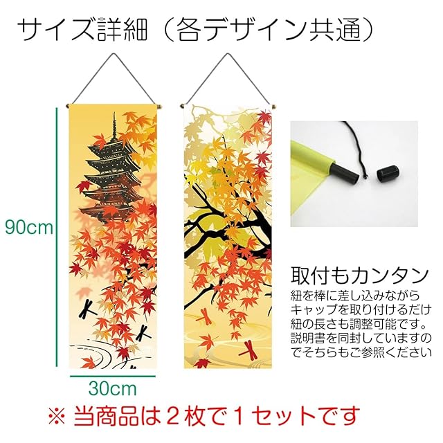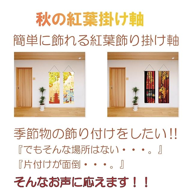 ✅もみじ・いちょう色づいた葉が舞い散る秋の紅葉デザイン。場所をとらず、収納もコンパクトな掛け軸タイプの秋のお飾り細タペストリー