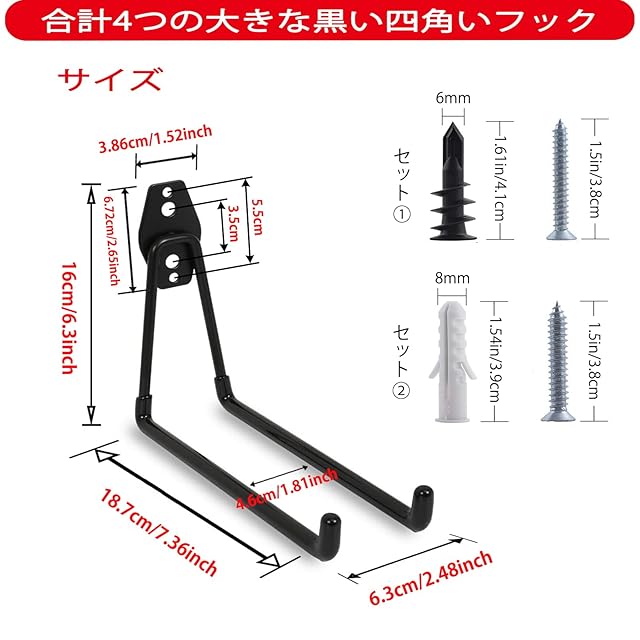 商品の説明 材質:鉄+PVCコーティング カラー:ブラック サイズ:L型小7 * 6.5 * 11cm / L型中13 * 6.5 * 13cm/L型大19 * 6.5 * 16cm J型小6.8 * 3.5 * 11.3cm / J型大10.2 * 3.5 * 14.6cm 重量:L型小113g、L型中159g、L型大213g、J型小111、J型大154g パッケージリスト: 4個セット*壁掛け フック、16本のネジ、16本のプラスチックプラグ