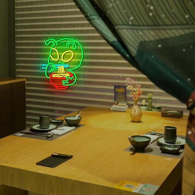 安全・安心設計: ラーメンを食べるエイリアンのデコレーションは、最高品質のフレキシブルシリコンLEDライトと丈夫で軽量なアクリルプレートで作られています。ガラスを使用していないため割れる心配がなく、有害な素材も含まれていないため、寝室に置いても安全です。安心してお使いください!