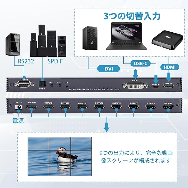 3x3 HDMI ビデオウォールコントローラー 4K@30Hz HDディスプレイ 1920x1080P 60Hz DVI USB-C RS232 映像入力 9 HDMI 出力 リモコン付き、縁消し、90°/180°/270°回転切り替え、13つのディスプレイモード3x3、1x1、1x2、1x3、1x4、2x2、2x3、2x4、2x1、3x1、4x1、3x2、4x2