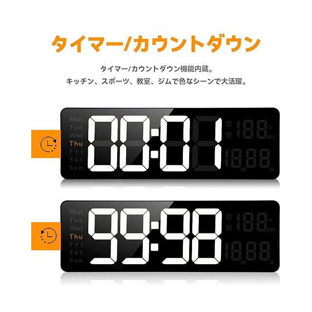 【 多機能LED目覚まし時計】①日付/曜日表示 ②温度表示 ③12/24時間制 ④華氏温度℉/摂氏温度℃表示 ⑤タイマー ⑥スヌーズ ⑦タイムメモリー機能 ⑧明るさ調整 ⑨簡単なリモコン操作。 縦置き、平置き、壁掛けが可能です。 こちらの壁掛け時計はタイマーとカウントダウン機能(最大99分99秒)を搭載し、タイマー機能は途中での一時停止に対応しています。 この2つの機能は用途が広いので、料理や運動、勉強など、さまざまなシーンで活用できます。お客様はご自分の好きな方法を自由に選択することができます。