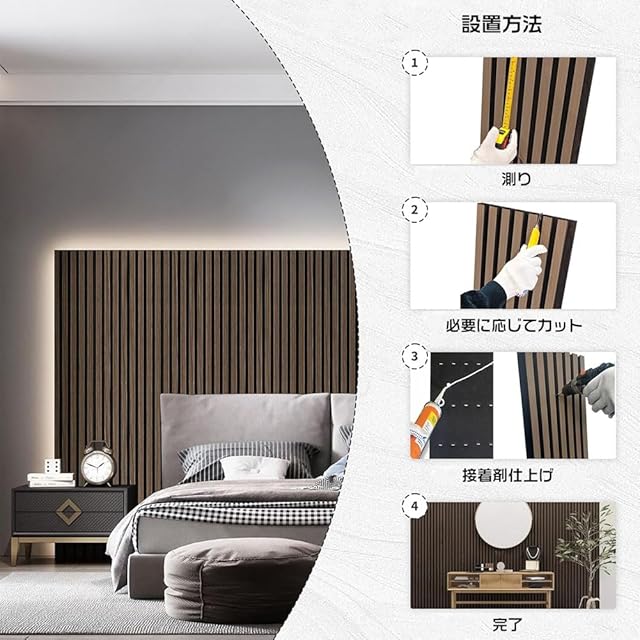 【デザイン性と機能性を備えた吸音ウォールパネル】木と吸音クッション材を組み合わせた壁パネル軽量タイプ。近隣からの騒音が気になるベッドルーム等の壁面に設置することで近隣からの騒音を軽減し、静かで落ち着いた生活ができます。施工効率が良く女性でも手軽にDIYすることが出来ます。