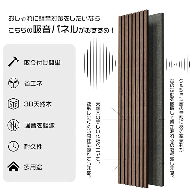 快適な生活空間を実現するために、吸音パネルは見た目にも美しく機能的なインテリアアイテムです。この天然木パネルは、お部屋の騒音問題を解決し、同時におしゃれな空間を演出します。<br> ■商品詳細<br> サイズ(約):高さ120cm、幅32cm、奥行き22mm<br> 重さ(約):1枚あたり2.75kg<br> 素材:木材(MDF)、吸音材:ポリエステル<br> お部屋の雰囲気に合わせてベージュ、ブラウン、ダークブラウンの3色をご用意しています。<br> ■商品特徴<br> 高級感のある天然木ならではの質感。<br> 高級感のあるウッドパネル。<br>
