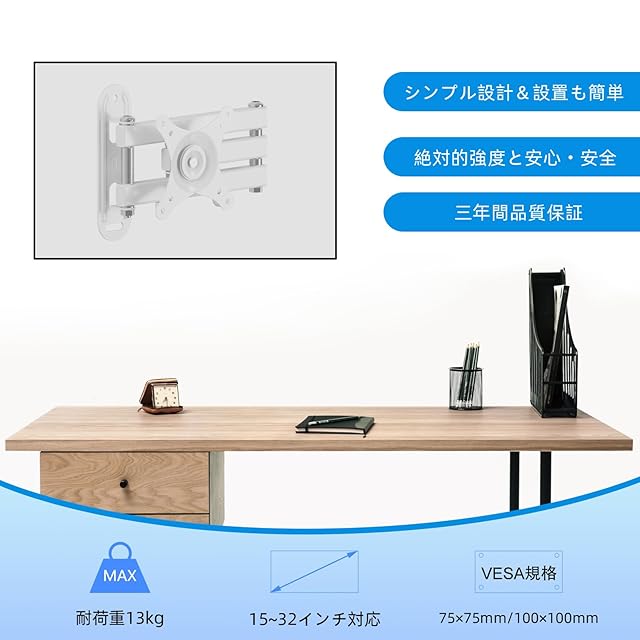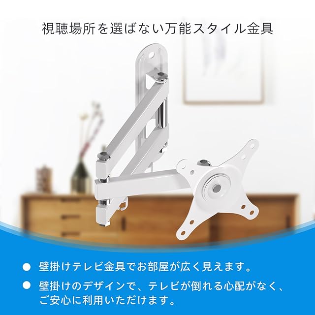 【対応機種】15~32インチモニターやテレビに対応するアーム式壁掛け金具です。耐荷重13kgで 、VESA規格75*75mm~100*100mmまで、小型テレビにオススメ。※ご注意:乾式壁・石膏ボードのみへの設置はお止めください!木間柱壁の場合は、アンカーを使用しないでください。