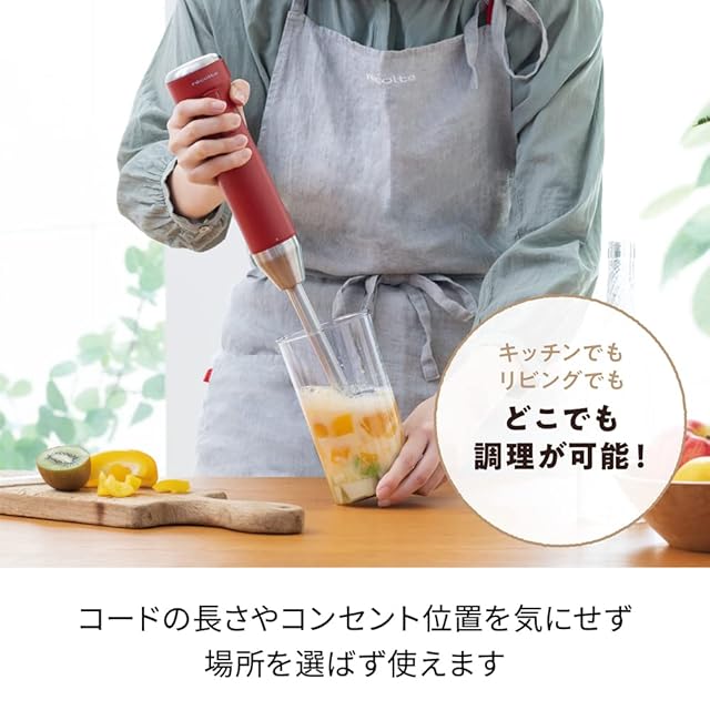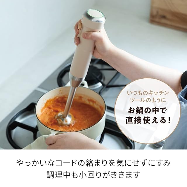 USB充電式で手軽に使える[コードレスハンディブレンダー]。 コードレスだから、コンセントの位置やコードの絡まりを気にせず使えるので、調理中もノーストレス。キッチンやリビングなど場所を選ばず快適に使えます。 ■スリムでスタイリッシュなUSB充電式 立てておくだけでスッキリ収納・充電までできるUSB充電式(Cタイプ)。 [充電台]付きだから、手に取りやすい場所にスタンドしておけて、使いたい時にいつでもサッと使えて便利。キッチンに出しっぱなしにしていても気になりません。 ■コード式ブレンダーと同じレベルのパワフル設計 USB充電式のコードレスタイプながら最大約1万4000回転/分(【高速】使用時の場合)と、コード式にも引けを取らないパワフル設計。食材やレシピに合わせて高速ボタンと低速ボタンを押し分ける事で【低速/高速】のスピード調節が可能。(高速:約14,000回転/分 低速:約11,000回転/分) 手早くなめらかなペーストが作れ、ポタージュスープやドレッシング作りなどに大活躍。 また、氷や冷凍フルーツも液体と一緒に攪拌できるから、スムージーやフローズンドリンクも手軽に楽しめます。料理の下ごしらえはもちろん、お子様の離乳食作りにも重宝します。 ※冷凍フルーツなどの冷凍材料は半解凍、または解凍する。 ※家庭用製氷機で作った氷(2.5㎝以下)10粒程度(100g以下)を使用できます。 ■誤作動を防止するロック機能と充電のタイミングがわかる表示ランプ付き ロック解除ボタンと動作ボタンの2段階操作で誤作動を防止。ロック解除ボタンを長押しする事で表示ランプが緑に点灯し、点灯中に運転ボタンを押すと使用可能に。約10秒間無操作で、ロックがかかる仕組みです。 表示ランプが赤色点滅したら充電のタイミングです。点滅後約3分間使用可能。 ■鍋肌を傷つけないブレンダーガードカバー付き 鍋肌を傷つけず、飛び散りも防止する取り外し可能なカバー付き。鍋やボウルに直接使えるから、調理がスムーズ。 ■カラダにやさしい15のメニューをご紹介している専用レシピブック付き ハンディブレンダーでのお料理が初めての方はもちろん、さらに幅広いお料理を楽しみたい上級者の方にもおすすめの“おいしくてカラダにやさしいとっておきのメニュー”をご紹介する専用レシピブックも付属しています。