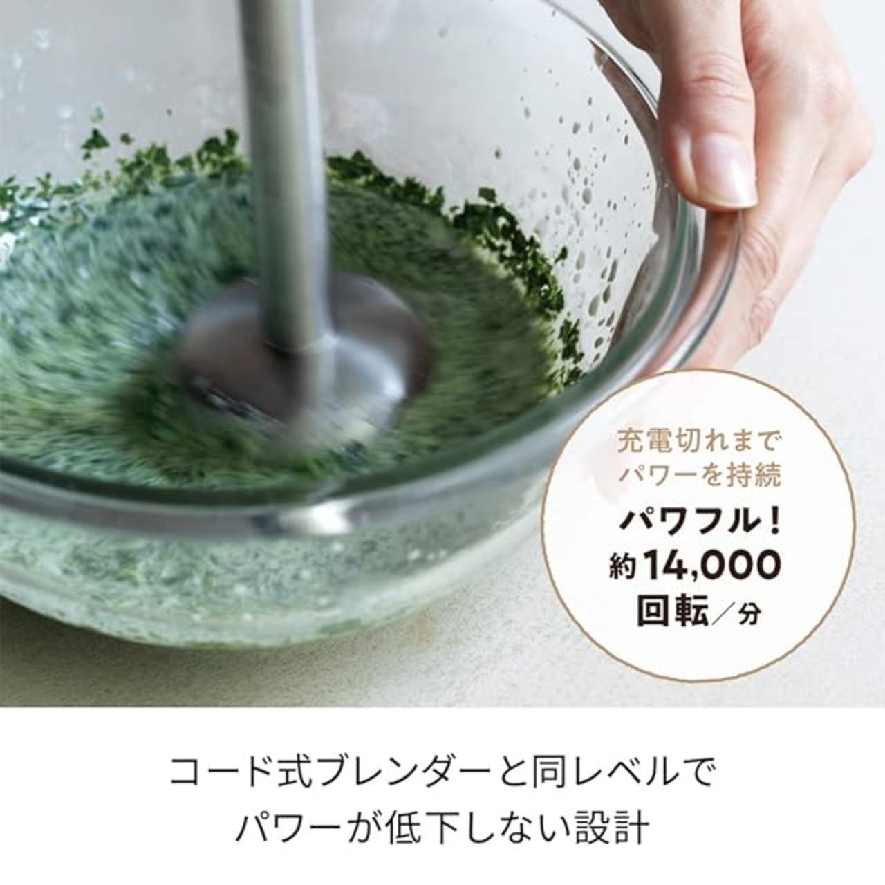 ✅【コード式ブレンダーと同じレベルのパワフル設計】USB充電式のコードレスタイプながら最大約1万4000回転/分(【高速】使用時の場合)と、コード式にも引けを取らないパワフル設計。