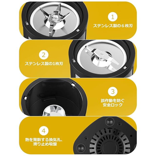 【食品級材質&安全安心】BPAフリーの無毒無害安全な素材で作られるミキサーです。モーターは純銅製なので、より耐久性があります。また本体とブレードカバーには高品質ABSを採用して耐寒耐熱性に優れております。カップはより高級な食品級PC材質を採用し、より健康的で環境に優しいです。それに、温度保護防ぐや誤作動を防止する安全装置が付けておりますので、安心安全にご利用いただけます。