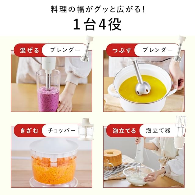 料理の幅がグッと広がる!1台4役[まぜる][つぶす][きざむ][泡立てる]