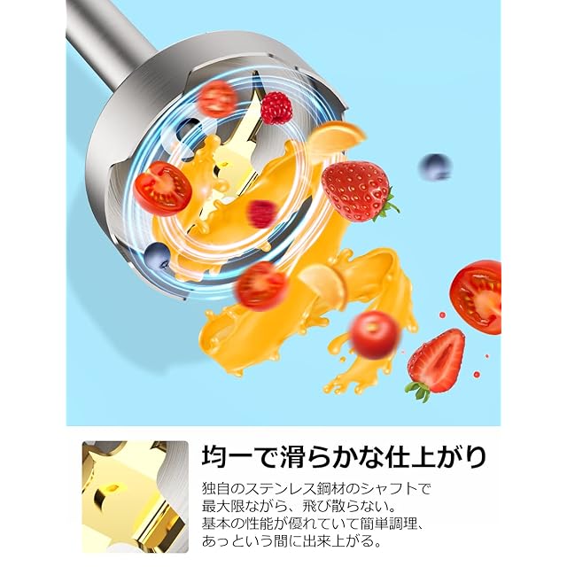 ❤飛び散り防止設計&2重スピード調整❤ ブレンダーの回転刃カバーには飛び散りを防止する独自の設計を採用、キッチンや衣服を汚す心配が少ないので、いつでもどこでも使えます。食材や料理に合わせて、精確さを追求した12段階スピード調整機能を搭載し、柔らかい野菜には低速モード、肉のきざみや果物等の固い果物のつぶしは高速モード(TURBO)がオススメします。硬いものの場合、薄くて小刻みに刻んで少々水を入れてスムーズに調理できます。やすく軽量設計&低騒音モーター採用】 グリップは滑りにくく握りやすい形状で、扱いやすいです。消費電力をおさえながら、スピーディーに調理が出来る工夫がされた低騒音モーターを採用、振動と音をおさえながら、パワフルモーター仕様になっています。