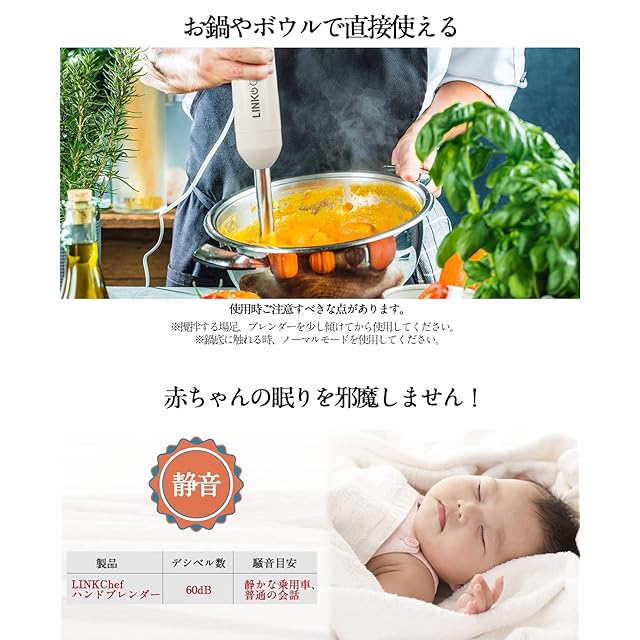 ハイパワー・時短2つの回転モード(低速と高速)を搭載!食材や料理に合わせてスピードを調節することができます。LINKChefのハンドブレンダーは、改良された800Wの純銅モーターを搭載しており、最大約15,000回転/分の高速回転力で料理時間を最大55%短縮することができます!たった3秒で野菜のみじん切り、ジュース、スムージー、離乳食などを瞬時に完成させることができます。パワフルな性能にもかかわらず、静音設計(60dB)なので、赤ちゃんが寝ているときでも気兼ねなく使えます。さらに、過熱や過負荷に対する二重保護機能も搭載されており、より安全にご使用いただけます。