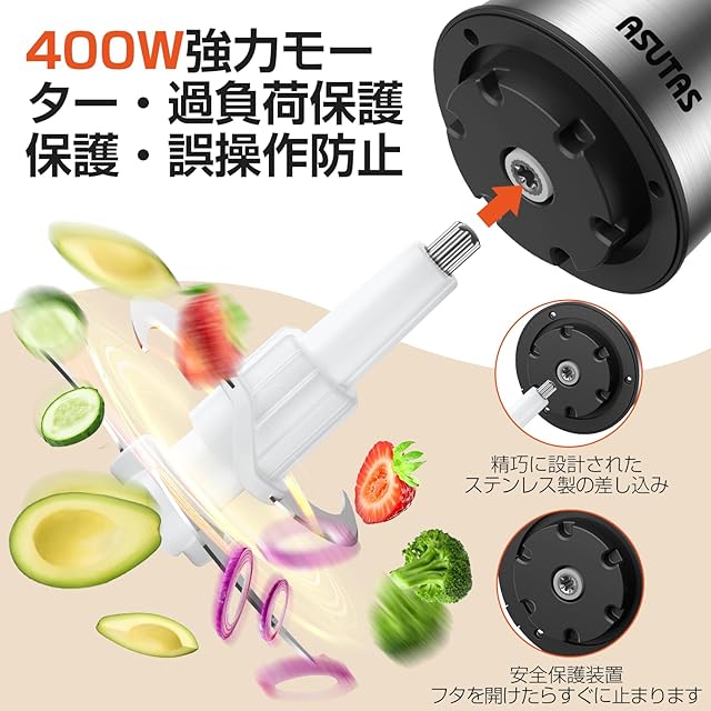 ASUTAS フードプロセッサー 2L大容量 【2ボウル】 1台5役 (刻む・混ぜる・潰す・砕く・粗おろし) 400Wハイパワー 2段階スピード 4枚刃カッター フードチョッパー 氷も砕ける ブレンダー 離乳食 電動 挽肉 みじん切り フードミキサー 家庭用 水洗い可能 スムージー PSE認証