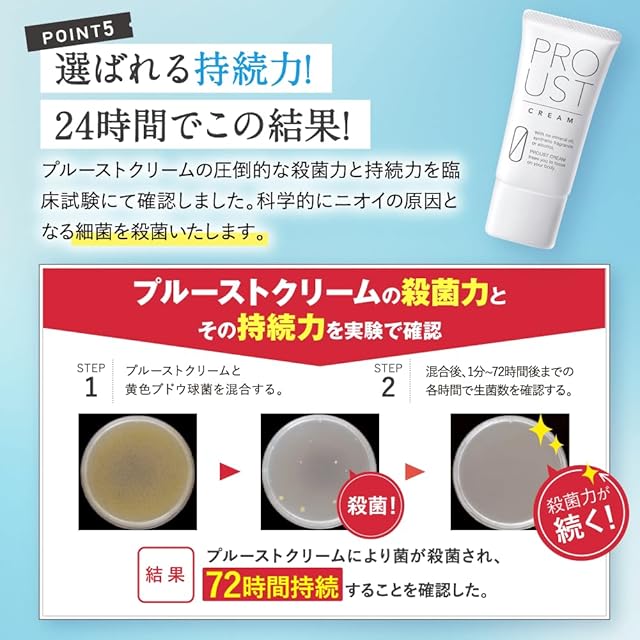 悩み続けたワキガに ・満足度93.8%※1 ・99.9%殺菌※2 ・3冠達成※3 プルーストクリーム-PROUST CREAM- 医薬部外品のワキガ対策 “圧倒的、無臭。“ ※1 2018年12月~2019年6月 第1回満足度お声調査結果 ※2 フェースサーベイ株式会社調べ(2019年3月) 黄色ブドウ球菌への殺菌試験 人に対して効果を保証するものではありません。 ※3 本商品 ※a 日本コンシューマリサーチ デオドラントブランドイメージ調査(2020年12月) プルーストクリームが医学専門誌に掲載されました 医学総合月刊誌『医学と薬学』は豊富な医学・薬学の情報が掲載されており、 大学・病院など医療関係者に広く読まれている伝統 ある雑誌です。 『プルーストクリーム』は第三者機関による黄色ブドウ球菌殺菌効力試験を行い、 その殺菌力が実証され、結果が『医学と薬学』に掲載されています。 数々のTVに出演するニオイの専門家も大絶賛! 「白残りもないのにしっかり汗のニオイを抑えてくれます。 銀イオンのスプレーでさんざんな目に遭ったシャツの変色も心配しないで済むのがいい ですね。」 プルーストクリームの予防効果を使用有無で、ニオイチェッカー を使って実験してみました! 未使用時:ニオイレベルが納豆と同程度... 塗布時:311→045 ニオイレベルがこんなに!※個人差があります。 変えたいのは、ニオイの『原因』 現役医師もコメントするクリームが、誕生しました。 驚異のワキガ対策メカニズム、5つのポイント POINT1:ワキガ対策! 爽やかな無臭を実現! 有効成分が、ワキガの原因となる汗と細菌を対策!香料などでごまかさず科学的にアプローチします!外出時などとっさにニオイや汗が気になる時にもぜひ使用してください! ※本商品 POINT2:実験済みの殺菌力! ワキガ予防に効果あり! プルーストクリームに含まれる殺菌成分「イソプロピルメチルダフェノール」がワキガの原因となる皮膚表面上の細菌を殺菌し、ニオイ の発生を抑制します! POINT3:さらすべっ!べたつかない サラサラの使い心地! ポリマー成分により、テクスチャーが良く、塗った直後でもべたつきません! POINT4:汗を対策! ワキ染み、もう気にしない! プルーストクリームに含まれる有効成分「クロルヒドロキシアルミニウム」が発汗を抑制!汗によってクリームが流れ 落ちることも防ぎ、長時間の効果を実現しました! POINT5:選ばれる持続力! 24時間でこの結果! プルーストクリームの殺菌力と持続力を実験にて確認しました。科学的にニオイの原因となる細菌を殺菌いたします。 プルーストクリームの殺菌力とその持続力を実験で確認。 実験方法 STEP1:プルーストクリームと黄色ブドウ球菌を混合する。 STEP2:混合後、1分~72時間後までの各時間で生菌数を確認する。 プルーストクリームにより菌が殺菌され、その殺菌効果が72時間持続することを確認した。 ※フェースサーベイ株式会社調べ(2019年3月) 黄色ブドウ球菌への殺菌試験 人に対して効果を保証するものではありません 毎日使っていただきたいから、肌にやさしい処方。 合成色素、合成香料、アルコール、すべて無添加! クリーンな毎日を新提案! 薬用プルーストクリームの”圧倒的無臭”をお確かめください。※本商品 デオナチュレ、オドレミン、デオコ、デオエース、ラヴィリン、メンソレータム、パースピレックス、リフレア、ワキガード、わきが最強クリーム、ワキガ デオドラント 最強、足の匂い消し、サラフィネ、ソフトストーン、ワキガ クリーム、qb薬用デオドラントクリーム、パースピレックス