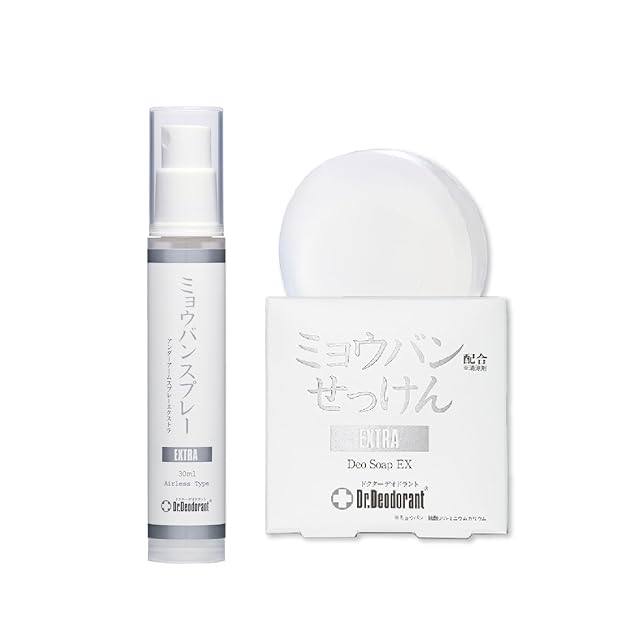 ※スプレー容器はエアレスタイプで使用するたびに、底が上に上がっていく仕様になっております。 本気でニオイ対策したい人の為に開発された専門ブランド「ドクターデオドラント」のパーフェクトデオドラントセットEX(ミョウバンスプレー EX、薬用ミョウバンせっけん EX)はワキ・足の「ニオイが気にならない」が超持続! ミョウバンは安全性の試験項目を全て通過した不純物の無い化粧品グレードを使用。成分は体臭の専門医との共同開発なので、一番効果のある濃度で配合。【薬用ミョウバンせっけんEXはリニューアル版となります。成分、パッケージ等一部変更となっておりますが、消臭効果は変わりません】