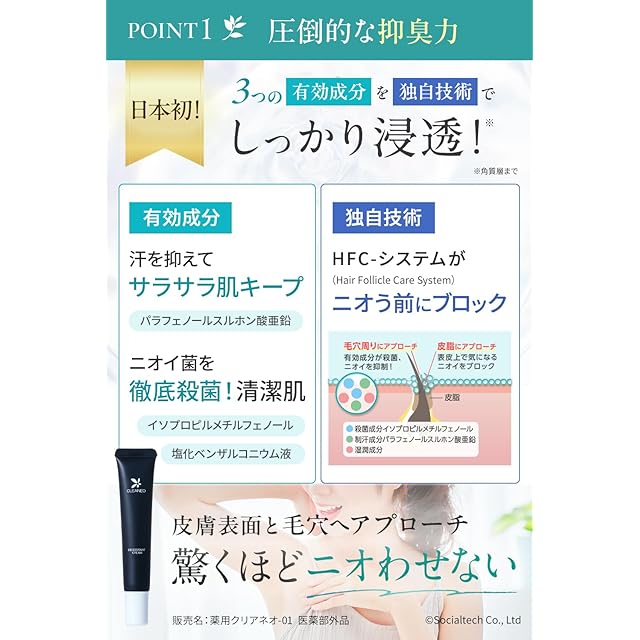 わきが臭対策に。発汗による皮膚汗臭のほか、加齢による酸化臭・脂臭も抑えます。ニオイの原因菌を殺菌、強力抑臭、高純度保湿が同時に可能。肌環境正常化への近道です。