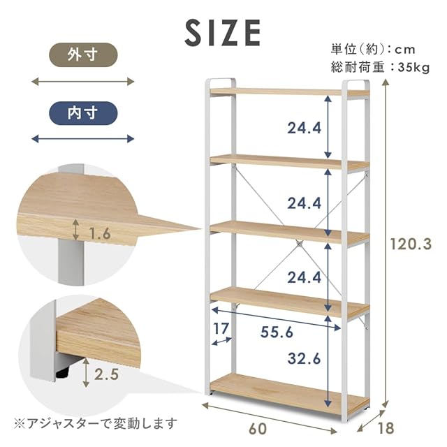 アイリスオーヤマ スチールウッドスリムラック 収納棚 本棚 ナチュラル/グレー 幅約60.0×奥行約18.0×高さ約120.3 総耐荷重:35kg(棚板:7kg) リビング/キッチン 横揺れを抑えるクロス補強 アジャスター・転倒防止紐付き 必要工具:プラスドライバー 一人暮らし おしゃれ LaLassicシリーズ LSWR-600