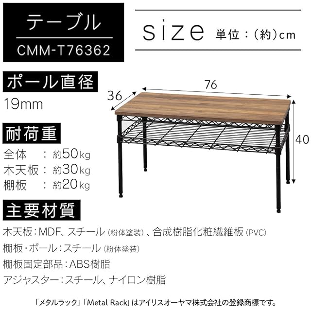 アイリスオーヤマ テーブル 収納付き ノートパソコンも置ける 木目調 おしゃれ テレワーク推奨 カラーメタルラック 幅76×奥行36㎝ CMM-T76362 ブラック