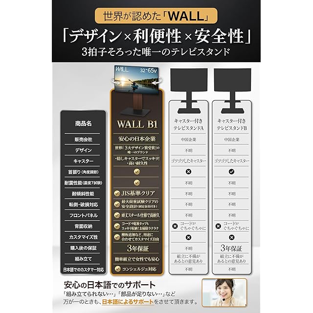 WALL B1 テレビスタンド 隠しキャスター付き 首振り ハイタイプ ウォールナット 耐震 震度7対応 高さ4段階調整 32~65インチ対応 可動式 移動式 自立 壁寄せ テレビ台 穴開けない 工事不要 組立簡単 背面収納 おしゃれ 壁掛け風 tv stand EQUALS イコールズ ウォール