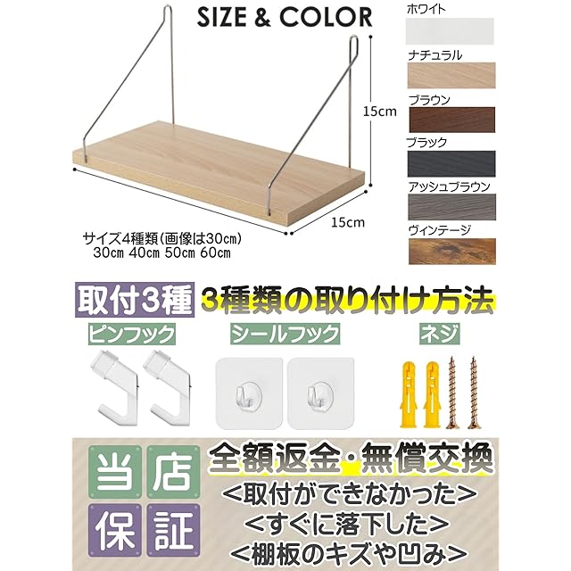 【商品仕様】○サイズ:幅30cm or 40cm or 50㎝ or 60㎝×奥行15cm×高さ15cm ○カラー:ナチュラル/ホワイト/アッシュブラウン/ブラック/ブラウン/ヴィンテージ ○セット内容:ウォールシェルフ本体×1、取付け用ネジ×2、石膏ボード用アンカー×2、ピンフック×2、落下防止ガード、日本語取扱説明書 ○素材:木材 ステンレス ○耐荷重:3-10kg ○ブランド:MeeBeeZ ※1枚目のメイン画像は30㎝幅になります。