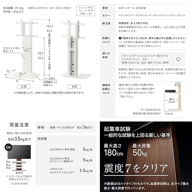 【対応テレビサイズ】24~55インチ(20kg相当)まで ※テレビの取り付け可否につきましては、メーカーのホームページ「WALLテレビ対応表」をご覧ください。