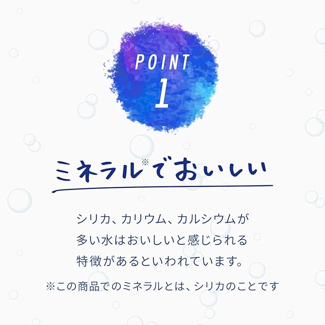 栄養成分(100ml当たり):エネルギー 0kcal、たんぱく質 0g、脂質 0g、炭水化物 0g、食塩相当量 0.11g、カリウム 13~23mg、カルシウム 0.5~4.0mg、マグネシウム 0~2mg、シリカ 50mg/L(東日本地区)、10mg/L(西日本地区)※地区により、お届けの商品のシリカ含量が異なる場合がございます。