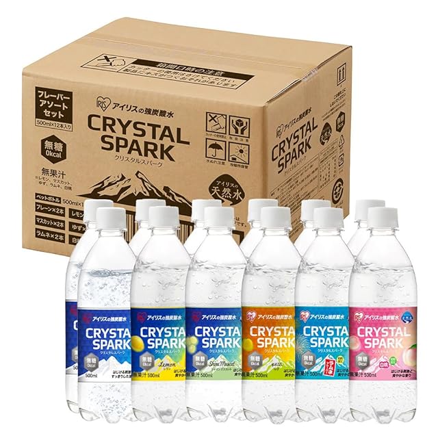 【6種飲み比べセット】炭酸水 500ml ×12本 ラムネ 白桃 ユズ マスカット レモン プレーン 強炭酸水 アイリスオーヤマ ペットボトル CRYSTAL SPARK(クリスタルスパーク)