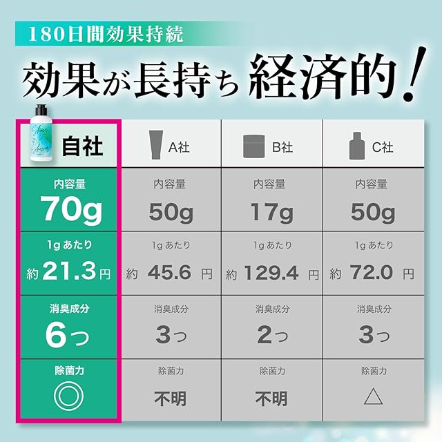 【経済的で長期的な効果】:1週間程度継続して使用することで、最大180日間消臭効果が続きます。70gの大容量でコストパフォーマンスに優れています。定期的な買い替えの手間を減らし、経済的負担も軽減します