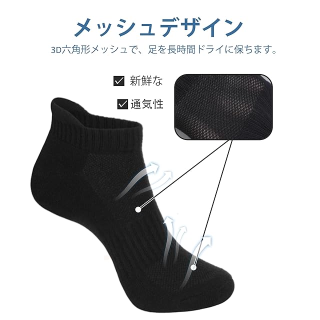 通気性のあるメッシュ: この靴下 メンズ、甲に戦略的に配置されたメッシュパネルが通気性を高め、臭いの蓄積を効果的に減らします。ランニングやハイキングのときでも、足は一日中ドライな状態を保ちます。