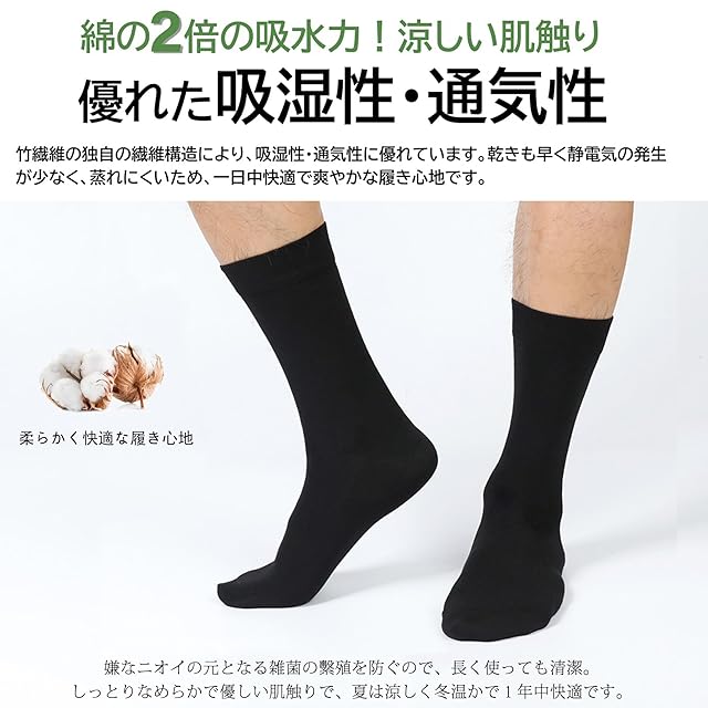 【抗菌消臭・吸湿速乾】竹繊維のビジネスソックスには天然の抗菌効果があります。 竹繊維の原毛に含まれるナトリウム銅クロロフィルによる良好な消臭効果。また、抗菌防臭加工を施しておりますので、消臭効果も倍加しています。また、吸湿性と放湿性に優れて乾きも早くて、静電気がほとんど発生しないため、肌の弱い方や高齢者の方でも安心して着用することができます。