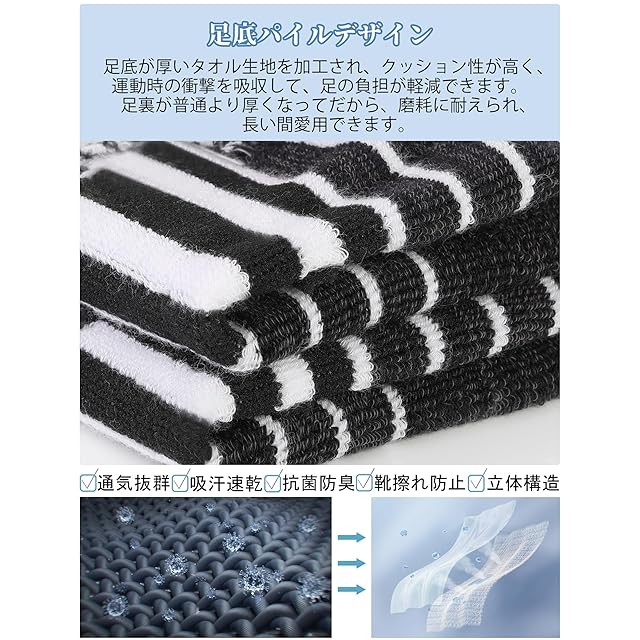 【タオル足底のデザイン】足底が厚いタオル生地を加工され、クッション性が高く、運動時の衝撃を吸収して、足の負担を軽減できます。足裏が普通より厚くなってだから、磨耗に耐えられ、穴あきにくくなります。