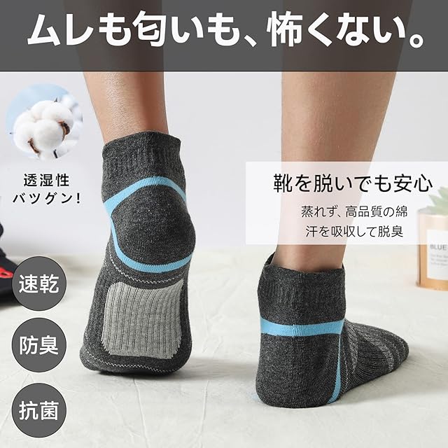 【抗菌 防臭・吸汗速乾】良質なコットンを使用し、抗菌防臭加工を施しておりますので、消臭効果を発揮し、気になる雑菌や足のニオイを抑制します。優れた通気性を持っており、長時間の着用でも蒸れずに。