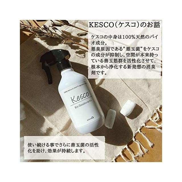 【バイオ消臭剤 ケスコ消臭スプレー】ケスコの中身は100%天然のバイオ成分。悪臭原因である”悪玉菌”をケスコの成分が抑制し、空間が本来持っている善玉筋群を活性化させて、根本から浄化する新発想の消臭剤です。使い続けることでさらに善玉菌の活性化を助け、効果が持続します。【嫌な臭いを元から断つ!】乳酸菌・光合成細菌・酵母菌などの有用微生物を特殊な方法で培養したKESCO(ケスコ)善玉菌群が、悪臭の原因物質や悪玉菌に強力に働きかけて抑制し、お花や洗剤、香水等の良い香りは消さずに、悪臭を元から断ちます。【天然成分100%の安全な消臭液】乳酸菌・光合成細菌・酵母菌などの有用微生物を特殊な方法で培養し作られており、化学物質を一切使っていないので、小さなお子さんやペットがいるご家庭や、敏感肌やアレルギー体質の方でも安心してお使いいただけます。【気になる「夏のにおい」を徹底対策】夏になると湿気や気温が高くなり、雑菌が繁殖したり、カビが増えて嫌なニオイが発生しやすくなります。そして、夏は1年のなかで最も汗をかく季節。主に、かいた汗が皮膚の表面で皮脂やアカなどと混じり合い、それを細菌が分解する際に臭いが発生します。ケスコならニオイの原因を抑制し、嫌なニオイを元から消臭!快適な夏を過ごせます。【内容量】消臭スプレー本体 370ml【成分】バイオ活性水【液性】弱アルカリ性【用途】便尿臭 (人・ペット) 、タバコ、靴・靴下、布製品、加齢臭、洗濯物、エアコン (室内・車内) 、加湿器