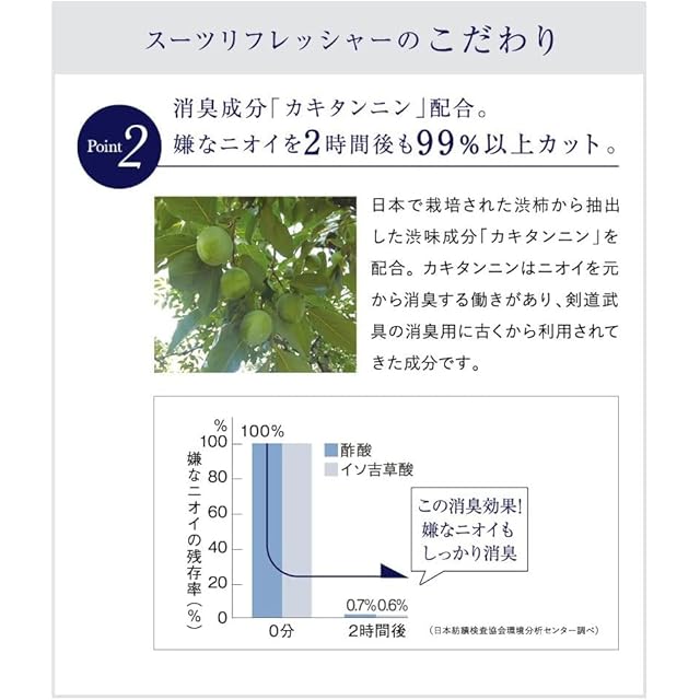 【消臭成分「カキタンニン」配合。 嫌なニオイを2時間後も99%以上カット】日本で栽培された渋柿から抽出した渋味成分「カキタンニン」を配合。カキタンニンはニオイを元から消臭する働きがあり、剣道武具の消臭用に古くから利用されてきた成分です。