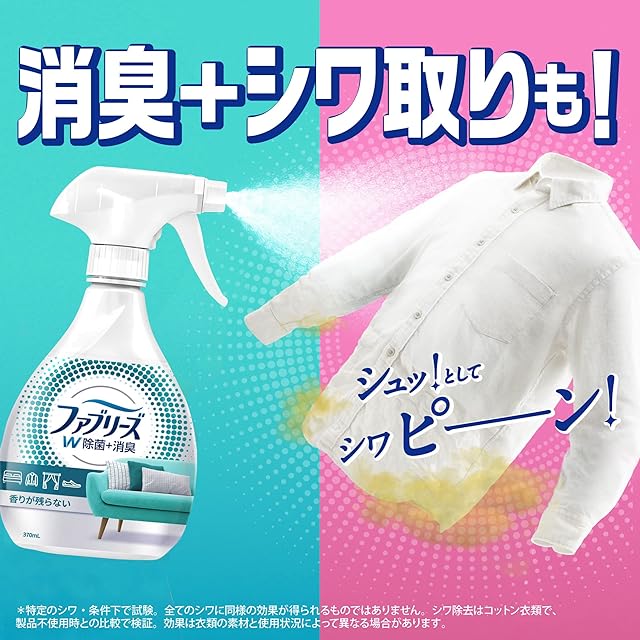 シュッとスプレーして伸ばせばシワ取りも。特定のシワ・条件下で試験。(全てのシワに同様の効果が得られるものではありません。シワ除去はコットン衣類で、製品不使用時との比較で検証。効果は衣類の素材と使用状況によって異なる場合があります。)