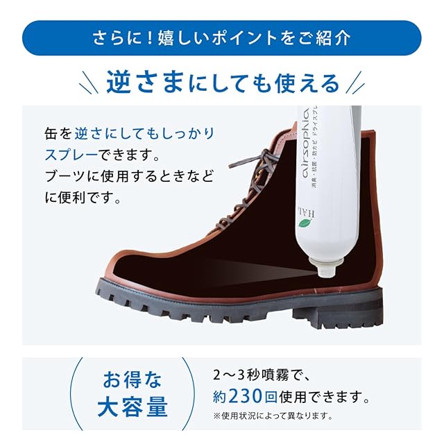 【優れた速乾性】靴などを履く直前に使用しても、速乾性が高いので湿り気を感じずすぐ履くことができます。噴射・拡散力が高く、靴のつま先までしっかり届きます。