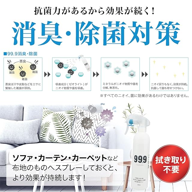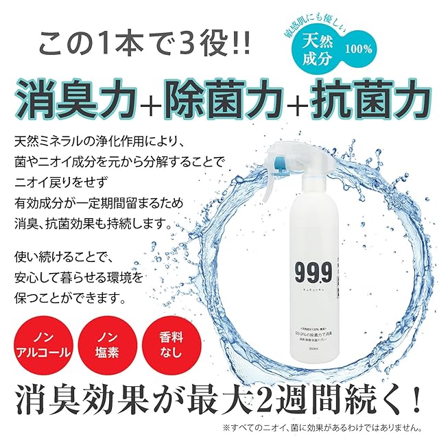 <strong>✅消臭対象</strong></br> 枕 衣類 靴下 ストッキング タイツ 靴 車のシート ソファ カーテン じゅうたん 帽子 ヘルメット 壁紙 生ゴミ </br><strong>✅分解消臭</strong></br>ニオイを分解するからニオイ戻りしにくい</br><strong>✅瞬間消臭</strong></br>トイレ 下駄箱 寝室</br><strong>✅天然成分100%</strong></br>無添加 無香料 ノンアルコール ノン塩素の化学合成物質ゼロ</br><strong>✅効果的な使用方法</strong></br>臭う前にスプレーをまんべんなくしてください。ニオイが付着しても軽い衝撃や手で振り払うだけで消臭できます</br><strong>✅ケース①</strong></br>焼肉や中華、お好み焼きなどニオイが付着しやすい飲食店に行く前に、髪から衣類、バックなどに事前にスプレーして消臭対策</br><strong>✅ケース②</strong></br>靴下や靴のニオイ対策は、事前にスプレーしておくと消臭が継続しているので、靴を脱いだ際にニオイの心配なし</br><strong>✅ケース③</strong></br>体のニオイや汗のニオイ対策着用前にインナーやTシャツの全体にまんべんなくスプレーするだけ</br><strong>✅除菌力99.9%</strong></br>第三者機関により99.9%の除菌力を実証済み、高級ホテルでも導入が続いています