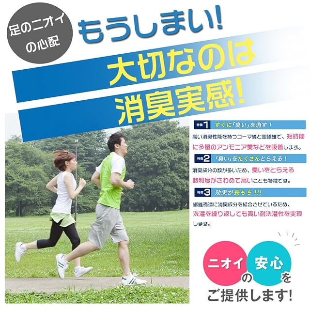 「ニオイの無臭化を実感できます!」綿100%の上質な40番手のコーマ糸を使用。高い消臭性能を持つ40コーマ綿と銀繊維で、短時間に多量のアンモニア臭などを吸着します。